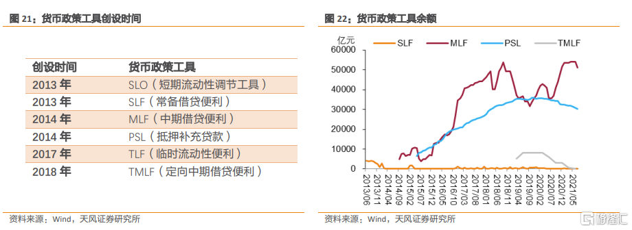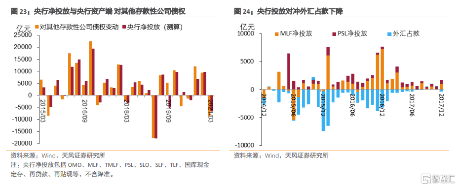 2014年下半年開始,外匯佔款開始系統性下降、流動性結構性短缺背景下央行開始主動調控基礎貨幣,對其他存款性公司債權逐步大幅增長。外匯佔款開始系統性下降,基礎貨幣投放主要渠道相應發生根本性變化,這增強了央行調控流動性的主動性。在流動性結構性短缺背景下央行可以更加主動通過貨幣政策工具(如OMO、MLF、TMLF、PSL、SLF、SLO、再貸款、再貼現等)進行基礎貨幣投放,這體現在資產端“對其他存款性公司債權”科目的大幅增長。
