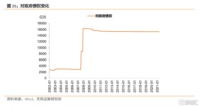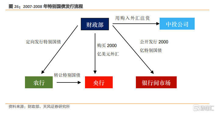 2007年,爲了配合財政部購買2000億美元外匯以作爲中投公司資本金,財政部分別於2007年8 月、12 月,向農業銀行定向發行6000 億元、7500 億元特別國債,然後由央行利用外匯儲備購買農業銀行持有的特別國債,體現在央行資產負債表上即爲2007 年8 月、12 月,對政府債權跳躍式上升(外匯佔款科目減少相應金額,不對基礎貨幣產生影響),之後一直穩定在16000 億元上下。