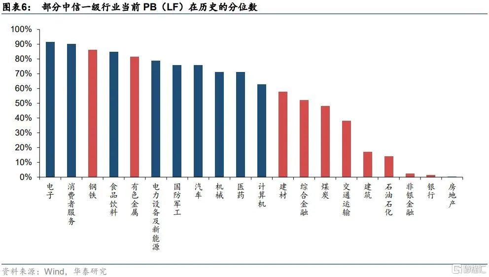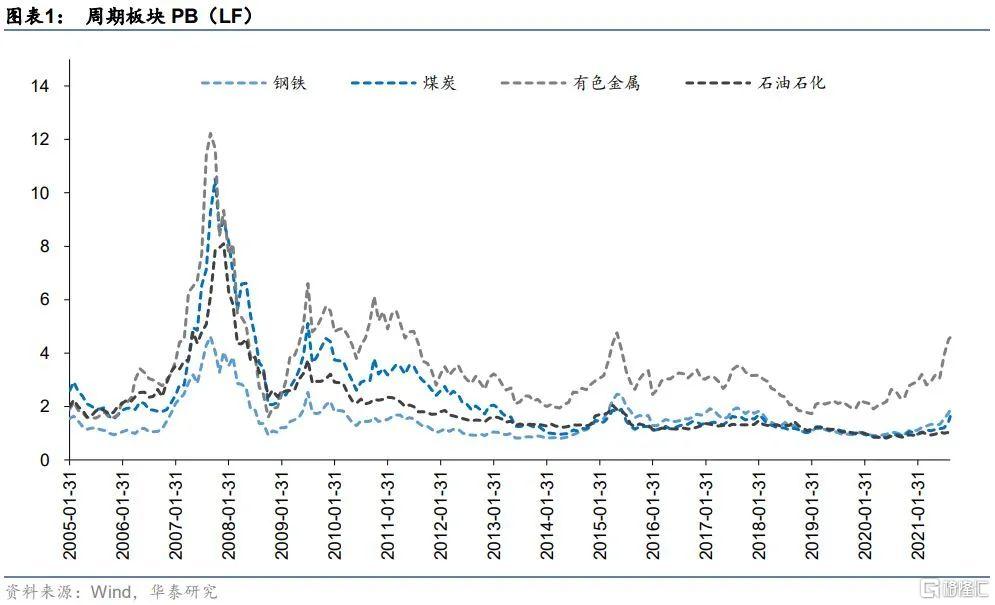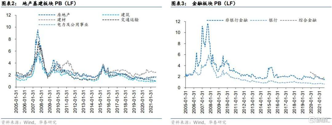 首先,雖然順週期板塊持續升溫,但從歷史分位數來看,相比於消費、醫藥、科技等已經經歷過一輪快速上漲的行業來說,週期、地產基建、金融等板塊的估值縱向與橫向相比整體仍處於低位,這些板塊仍然具有較高的價值投資屬性。我們從Wind整理了部分板塊內的中信一級行業自2005年以來的月度PB(LF)變化,如下圖所示。其中週期板塊中石油石化PB位於歷史後25%分位數左右,煤炭PB位於歷史後50%分位數左右,雖然鋼鐵、有色估值從歷史來看並“不算便宜”,但在高景氣度的預期下估值仍有進一步上行的空間。此外,地產基建、大金融等板塊整體估值也相對較低。