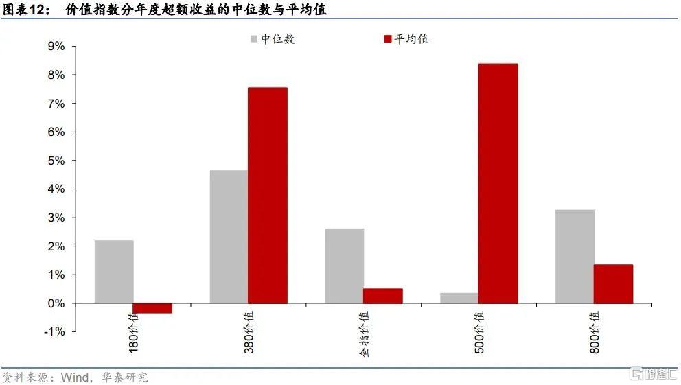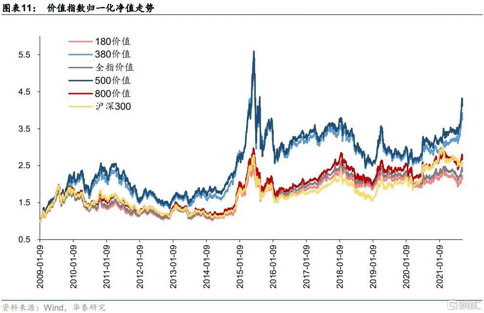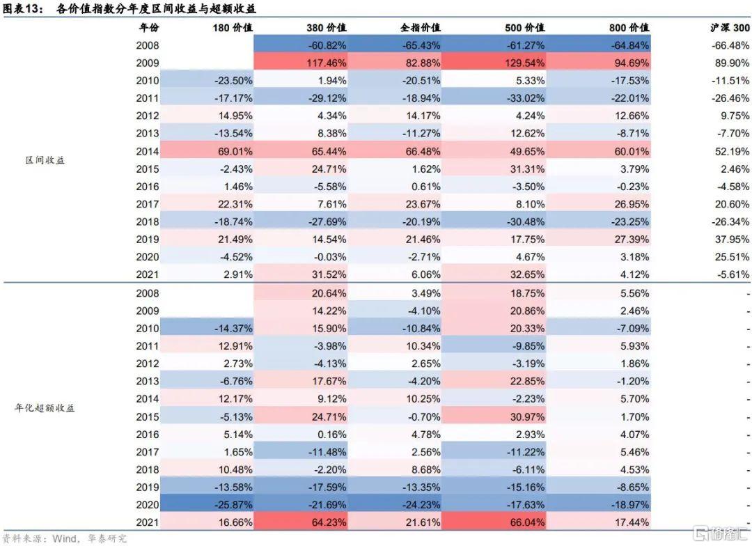 由圖表可見,在觀測期2009~2021年8月的區間內,各價值指數相對滬深300的分年度超額收益整體上表現較好。從中位數來看,各價值指數的分年度超額收益中位數均爲正;從平均值來看,也僅有180價值超額收益均值小幅跑輸滬深300,而380價值、500價值則平均超額收益較爲顯著。因此在較長的時間區間內,可以合理認爲價值投資指數具有較強的獲取超額收益的能力,價值投資風格適合長期秉持。雖然近兩年價值指數遜色於滬深300,但正如前文所述,風格輪動周而復始,價值風格底部佈局價值投資正當其時。