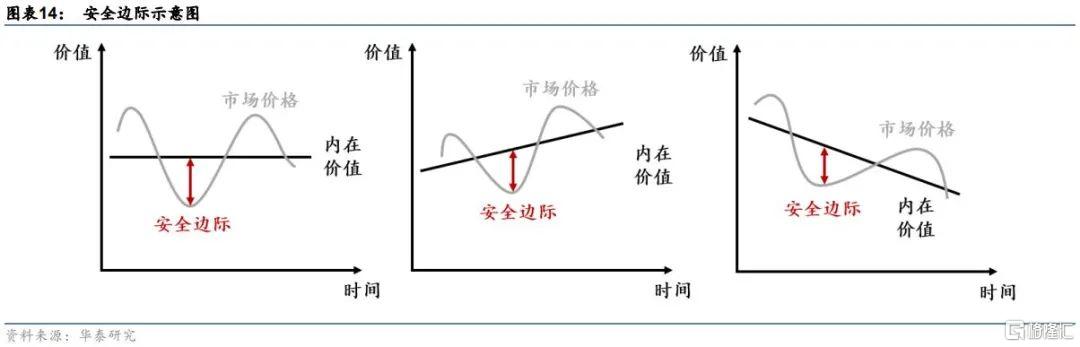 “價值投資是基於詳盡的分析,本金的安全和滿意回報有保證的操作”。價值投資理論的開山鼻祖本傑明·格雷厄姆在建立價值投資理論的同時提出了“安全邊際”的概念。根據證券市場基本理論,股票的價格圍繞價值上下波動,長期來看價格逐漸向價值迴歸。在價格低於價值時買入,再在高於價值時賣出即可獲得收益。價格低於價值的部分叫做安全邊際,是在投資者的血汗錢與失算、出錯、厄運和經濟市場本身的風雲變幻間搭起的緩衝區。一般來說,安全邊際越大,風險越小。在格雷厄姆的投資理念中,他強調價值爲有形資產與“絕對”安全。