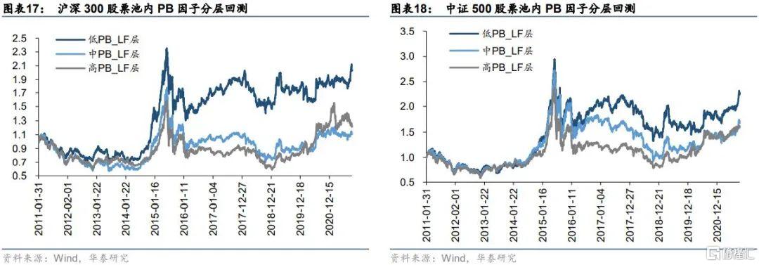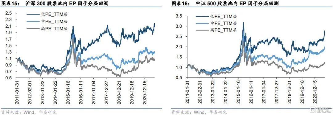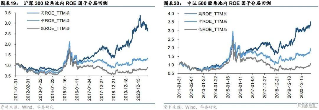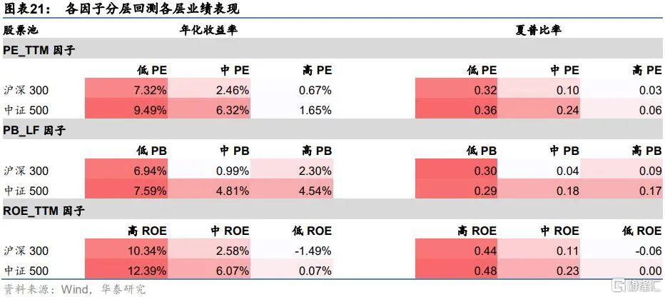 從估值指標來看,在代表大盤股的滬深300股票池內與代表中小盤股的中證500股票池內,低估值層股票的回測表現一致好於高估值層的股票,且分層表現整體隨着估值的增加而降低。具體來說,PE因子的單調性比PB因子更強,層次之間的區分更爲明顯,說明PE因子的在上述股票池內的篩選能力可能強於PB因子。