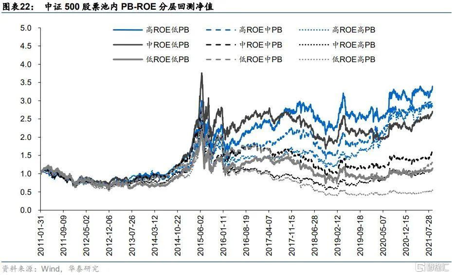 實證表明,價值投資的左膀右臂——估值和盈利因子在不同的股票池內均具有較強的選股能力,基於PB-ROE的因子選股模型是價值投資在量化選股領域的經典具象化選股模型之一,在實際操作中常根據PB與ROE因子進行聯袂選股,在中證500內的選股實證結果表明PB-ROE模型選股具有較好的選股效果。