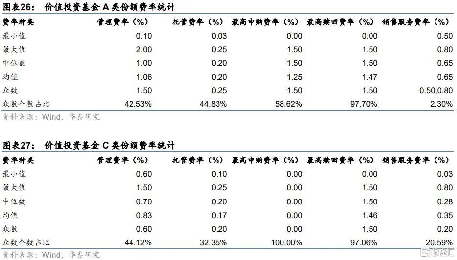 市場上的價值投資類基金主要以A類份額和C類份額爲主,我們分別對價值投資基金A類份額和C類份額的費率進行統計,如下圖所示。可以看到A、C類份額價值投資基金的託管費率爲0.2%,最高贖回費率爲1.5%。A類份額的最高申購費率大部分爲1.5%,大部分A類份額不收取銷售服務費,但管理費率較C類份額更高,中位數爲1%;C類份額管理費率中位數爲0.7%,無申購費,有銷售服務費,後者中位數爲0.28%。