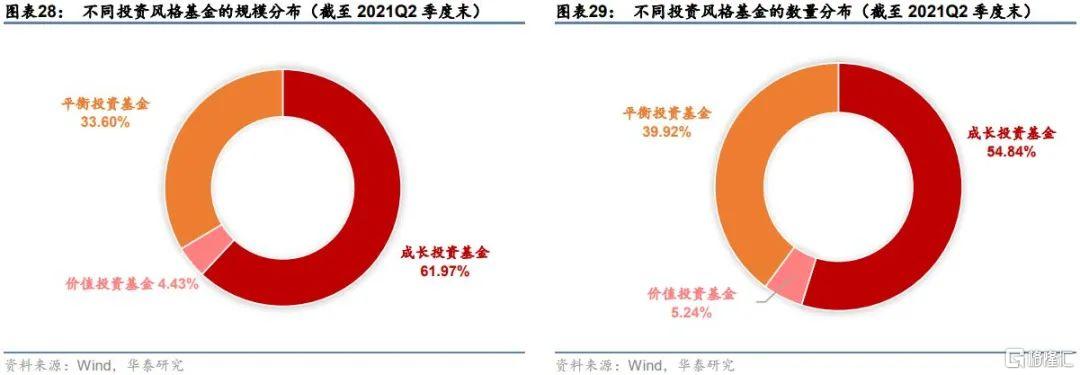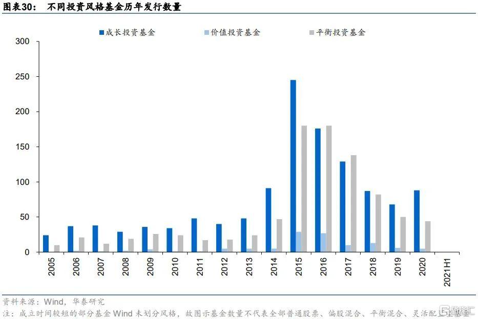 左下圖和右下圖分別展示了截至2021Q2季度末不同投資風格的基金規模分佈和數量分佈。可以看出,無論從規模還是數量,成長投資基金在基金市場上都佔據較大比重,規模佔比超過60%,數量佔比超過50%。其次是平衡投資基金,規模佔比33.60%,數量佔比39.92%。相比於成長和平衡投資基金,價值投資基金的佔比最少,規模佔比僅爲4.43%,數量佔比僅爲5.42%,在市場上屬於較爲稀缺的投資風格。圖表7展示了不同投資風格基金的歷年發行數量,可以觀察到,三類基金的發行數量變化趨勢較爲一致,但絕對值數量上差別明顯,自2015年以來,三類基金的新增發行數量均有所下行。