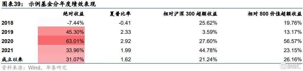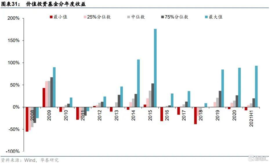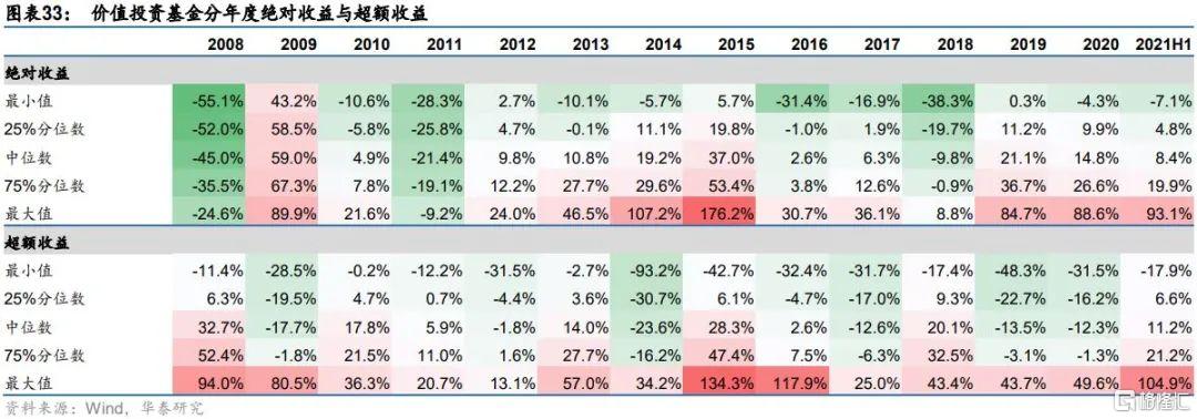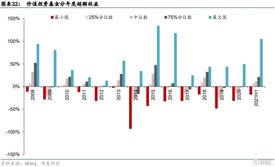 我們統計了所有價值投資基金自2008年以來分年度的年化收益和相對滬深300指數的超額收益,如下面圖表所示。不同的價值投資基金差異化明顯,在2008-2021H1的14年間,價值投資基金絕對收益的前75%分位數僅在2008、2011與2018年表現不佳,收益爲負,其餘年份均錄得正收益;超額收益的前75%分位數有9年爲正,且其中有5年超額收益超過20%。整體來說,頭部價值投資基金獲取超額收益的能力顯著,數量稀缺並不是價值投資風格基金的劣勢,相反獨特的價值投資風格是市場上其他類型投資風格的有效補充,適合作爲投資組合的一部分分散投資組合風險。