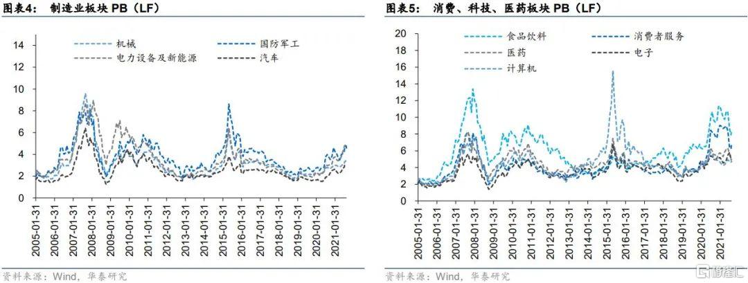 對比之下,製造業、消費、科技、醫藥等板塊的主流行業PB縱向或橫向均位於歷史高位,雖然年後在全球流動性預期轉向及微觀增量資金截斷的雙重背景下,上述板塊經歷了一輪殺估值行情,但其中食品飲料、消費者服務、醫藥、電子等行業的PB當前仍然位於歷史前25%分位數,估值依舊相對較高。
