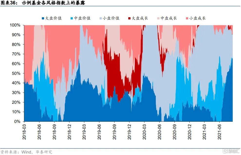 上圖中冷色調部分代表示例基金在價值風格上的暴露程度,暖色調則代表示例基金在成長風格上的暴露程度,可以看到絕大部分時間區間內該產品的風格暴露偏向於價值,僅在2019年短暫偏向成長。2020年以來隨着價值風格跌入低谷,示例基金進一步放大了在價值風格上的暴露程度,價值風格底部佈局,偏好小盤價值風格。整體來看,示例基金基本保持穩健的價值投資風格,長期來看沒有過於明顯的風格漂移現象,與其標籤一致。
