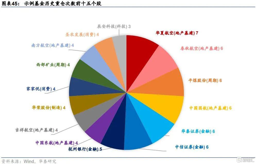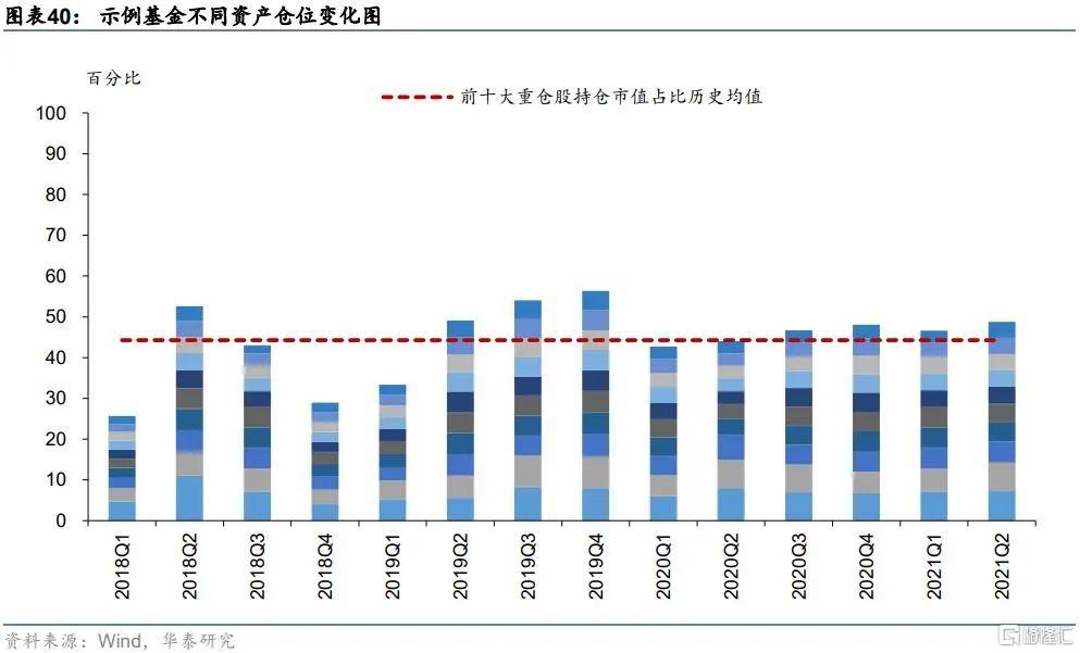 示例基金自成立以來各季度的前十大重倉股持倉市值權重如下圖所示,從歷史來看,基金成立早期持倉集中度偏低,2018至2019年初的整體集中度中樞在30%~40%之間。近兩年來持倉集中度有所上升,且各季度集中度變化幅度較小,基本維持在50%附近小幅波動,集中度適中。