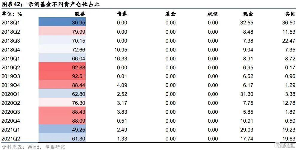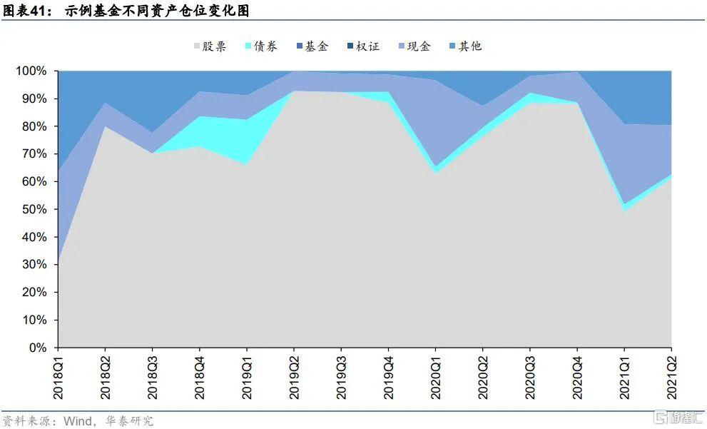 接下來分析示例價值風格產品其在不同資產的持倉情況,各季度變化趨勢如下圖所示。示例產品的股票持倉佔比各季度變化較爲明顯,最近兩年股票持倉佔比最低時僅爲49.25%,持倉佔比最高時爲92.88%,極差範圍較大,這說明管理人會進行一定的擇時操作。