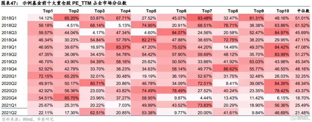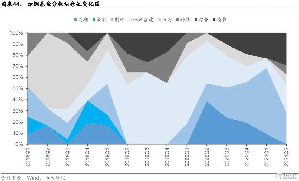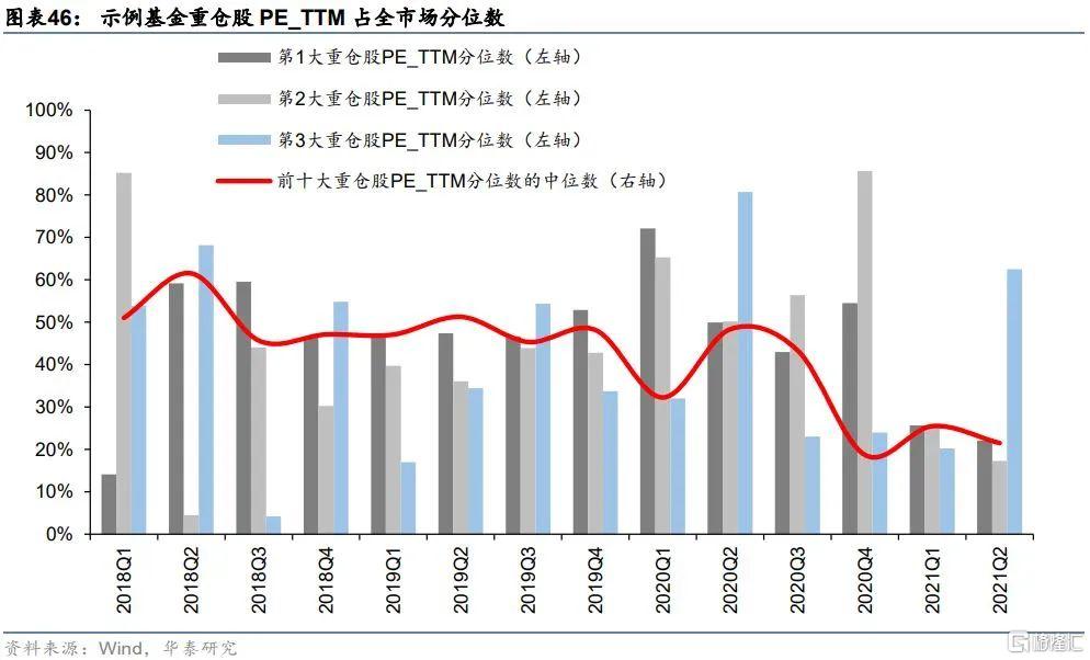 分析示例基金的歷史前十大重倉股,統計前十大重倉股各季度的PE_TTM在全市場的分位數,以此來觀察示例產品的持倉估值情況。下面柱狀圖繪製了前三大重倉股的PE_TTM分位數,紅色曲線代表前十大重倉股PE_TTM分位數的中位數。從單個重倉股來看,示例產品持倉個股整體估值程度較低,大部分個股的PE_TTM均位於市場後50%(按從大到小排序),較少部分個股位於市場前30%。從中位數來看,前十大重倉股PE_TTM分位數中值在40%~50%之間波動,最近一年估值還在進一步走低,分析財報公佈的前十大重倉股可知示例基金在2021年Q1與Q2季度增加了週期、金融等板塊中的低估值個股配置權重。
