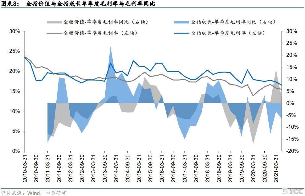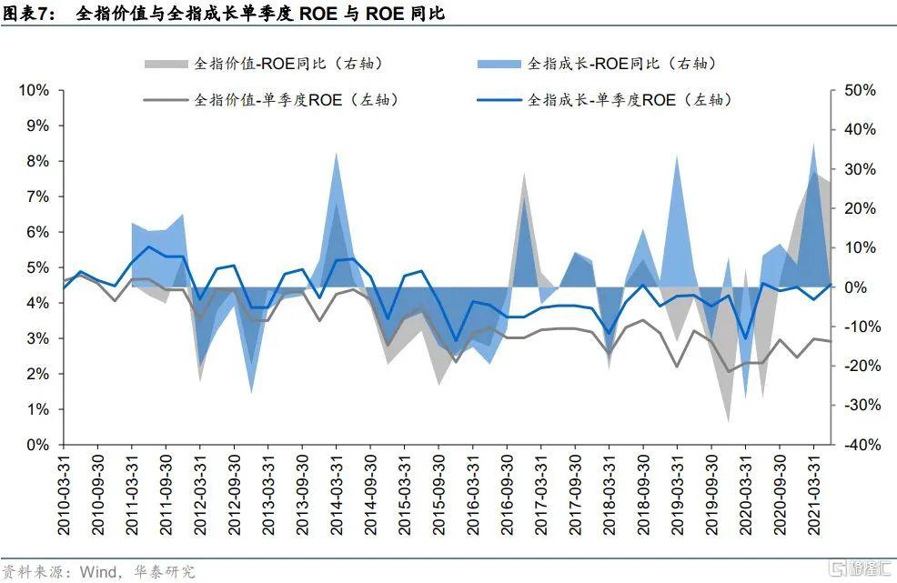 雖然偏價值的板塊當前的估值水平整體處於歷史較低位置,但從ROE與毛利率等其他基本面角度來看,偏價值風格的股票並非由於基本面太差而導致估值走低。下圖繪製了全指價值與全指成長指數自2010年以來的單季度ROE及同比、單季度毛利率及同比,可以看到近兩年價值股與成長股總體上體現出的盈利能力並未表現出過於極端的差別。