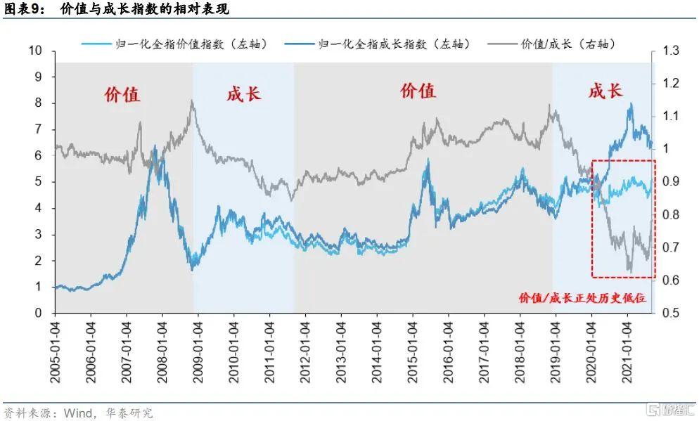 其次,價值指數與成長指數的相對錶現已經處於歷史底部。我們繪製全指價值與全指成長指數從2005年以來的歸一化淨值與相對錶現,如下圖所示。可以看到,自2005年以來,價值與成長的表現一直處於此消彼長的輪迴之中。2005~2008年價值指數表現佔優,價值與成長的相對錶現在2009年初登頂;此後成長風格開始主導,2009~2011年價值與成長的相對錶現不斷下行,2011年末邁入低谷。從2012年開始,價值風格觸底反彈,此後直至2018年末總體而言價值風格表現強於成長;2019年至今年年初成長風格表現亮眼,而價值風格相對低迷,價值與成長的相對錶現一路下探,目前正在歷史底部波動。
