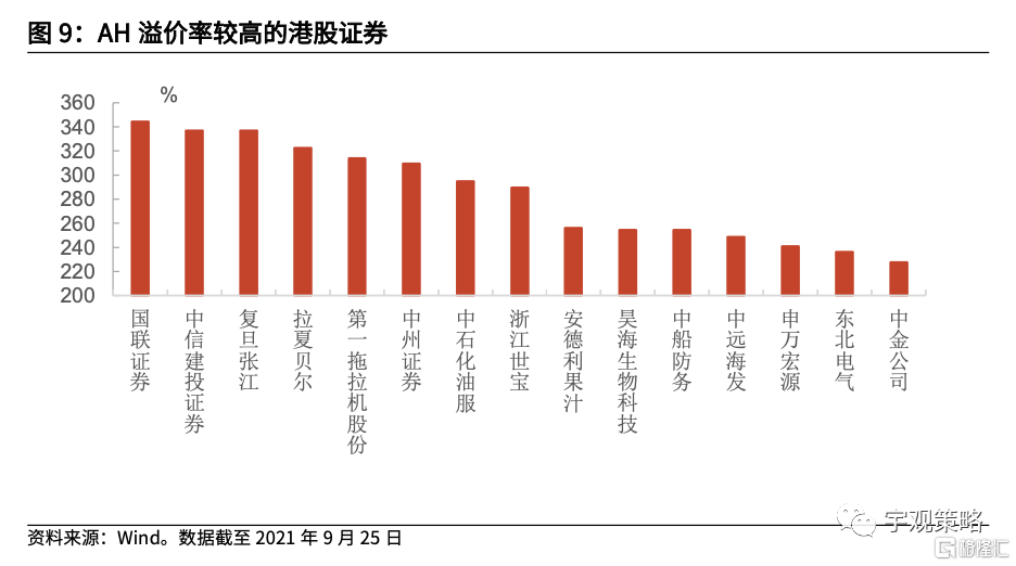若中美關係持續緩和,AH 價差有望進一步收斂。9月10日中國國家主席習近平應約同美國總統拜登通話;9月22日美氣候特使克里表示近期將再次訪問中國;9月24日孟晚舟女士啟程返回中國;9月24日美國商務部長雷蒙多表示將尋求改善美國與中國的商業關係。未來美方有動力減免對華關税,緩解通脹壓力。港股市場海外投資者佔比較高,中美關係緩和對風險偏好有着重要影響,AH價差有望進一步收斂。