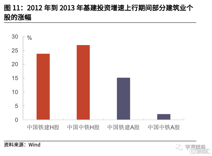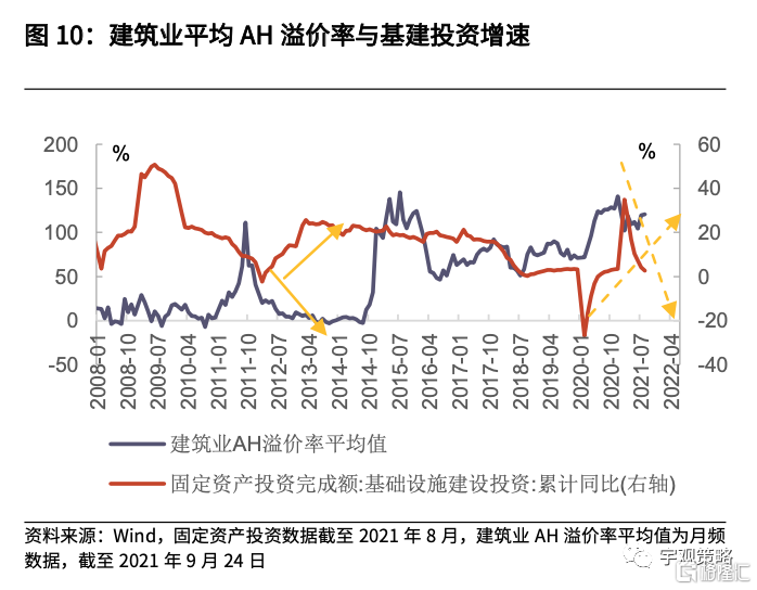 當總體AH價差收斂時,AH溢價率高的證券的AH溢價收斂程度也越高。歷史上來看,初始AH溢價率越高的證券,最終AH溢價率縮小得越多。當前可以關注AH溢價率高企的證券。隨着基建預期升温,建築業H股相對A股有望取得超額收益。當行業前景黯淡時,港股股價向下調整得更充分;未來隨着基建預期升温,建築業盈利預期有望持續得到改善,而H股本身基數較低使得其估值提升空間更大。