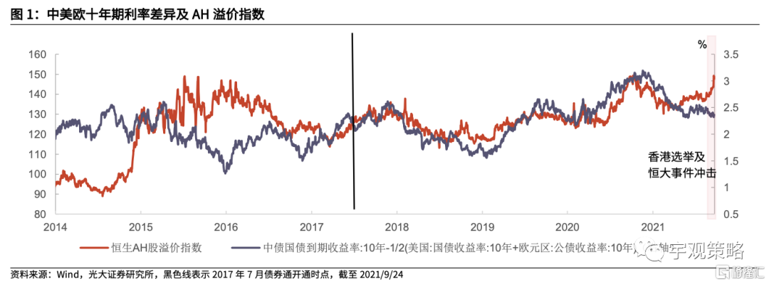 中國國債收益率大概率區間震盪。2017 年以後,AH 溢價指數主要受到中美 歐國債利差的影響。中國國債收益率方面,8 月公佈的經濟數據不及預期,在四 季度經濟下行壓力較大的背景下,如果政策寬鬆進行對沖,利率有重回下行的可 能。