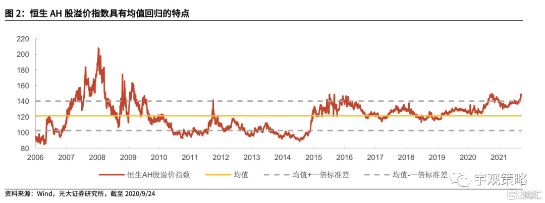 AH溢價具有均值迴歸的特性。實證顯示AH溢價長期具有穩定的均衡值,在該值上下波動並具有均值迴歸的特性。當前AH溢價高企,未來有望向中值迴歸。