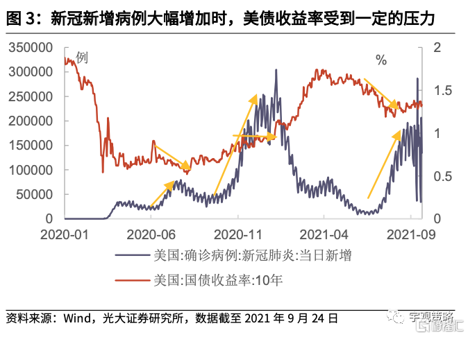 新冠疫情緩解有望助推美債收益率上行。歷史上來看,新冠新增病例的快速 上行,雖然後期對股市的影響減弱,但仍會引起市場對經濟復甦的擔憂,從而對 美國國債收益率造成一定的壓力。在新冠新增病例快速上行的時期,美債名義收 益率上行趨緩或有所回落,如 2021 年 6 月以來的美債收益率加速下行。美國新 增病例近期已出現見頂跡象,未來若從高位回落,有助於助推美債收益率上行。