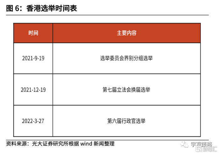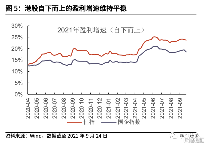 港股 2021 年自下而上的盈利增速維持平穩,隨着香港地區選舉活動暫吿一 段落,悲觀情緒有望得到修復。從港股自下而上的盈利增速可以看出,港股本身的盈利增速維持平穩,並未大幅下調。因此近期AH溢價與中美利差的偏離主要受到投資者風險偏好的影響,後者因為中秋期間香港選舉活動引發的政策不確定性而大幅回落。後市來看,目前選舉活動已經暫吿一段落,投資者風險偏好有望逐步恢復,AH溢價將隨之向下迴歸。