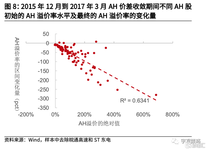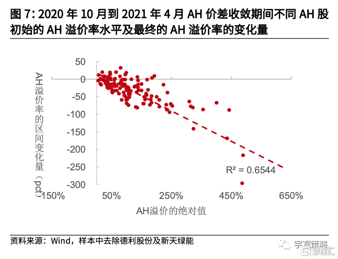 當總體 AH 價差收斂時,AH 溢價率高的證券的 AH 溢價收斂程度也越高。從歷史上數據可以看出,在最近的兩次 AH 價差明顯收斂的區間內,初始 AH 溢 價率越高的證券,最終 AH 溢價率縮小得越多。當 AH 價差開始收斂時,AH 溢價 率變化量與最初的 AH 溢價率水平成顯著的反比關係。因此當前仍然可以關注AH 溢價率高企的證券。包括國聯證券、中信建投證券、復旦張江、拉夏貝爾、 第一拖拉機股份、中石化油服、昊海生物科技、中船防務、中遠海發、申萬宏源 等 AH 溢價率超過 200%的公司。