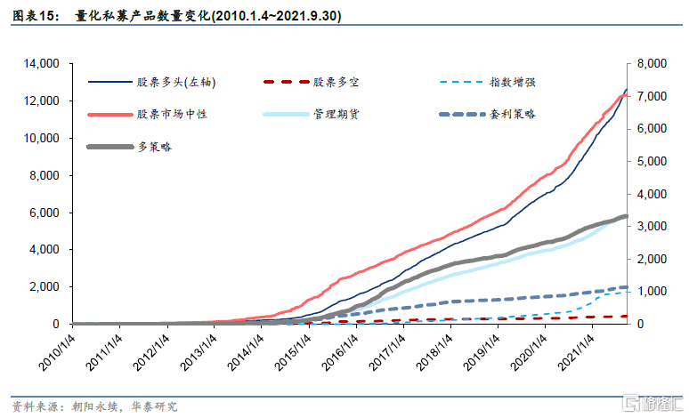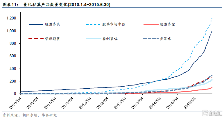 這個階段的股票市場中性策略存在小盤股風格敞口過大的問題,但由於收益穩定,該類策略率先獲得較快的規模增長。如下圖所示,股票市場中性產品的數量在2014年出現爆發式增長。