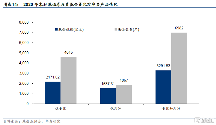2020年以來,百億級量化私募數量不斷增加,在2021年甚至出現了千億級量化私募。下圖爲基金業協會統計的2020年末私募證券投資基金量化對衝類產品情況。據基金業協會數據,截至 2020年末,共有量化/對衝策略基金13465只(含FOF),規模合計 6999.87億元,分別佔自主發行類私募證券投資基金總只數和總規模的26.2%和18.9%,較 2019年分別增長26. 2%和66.5%。2020年量化基金新備案規模爲318.69億元,同比增長365%。