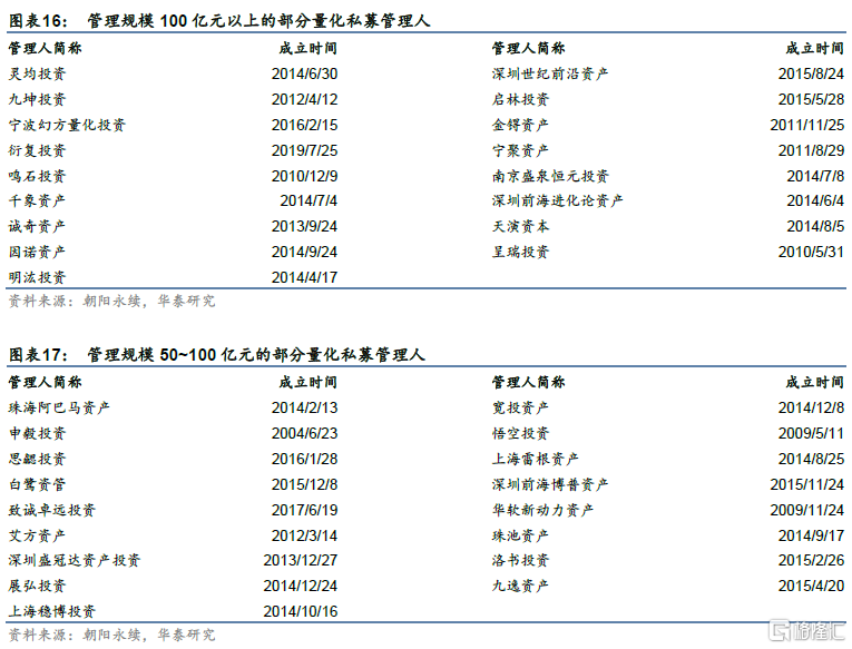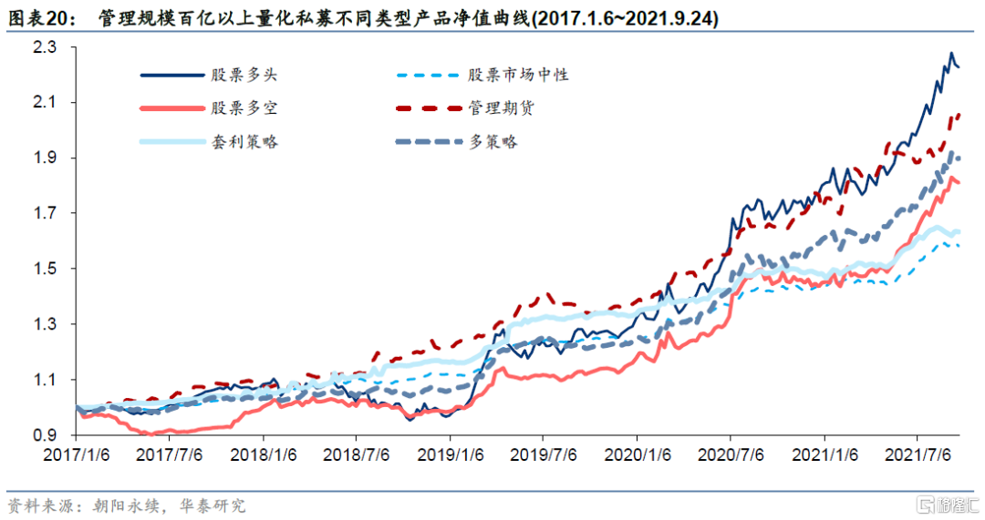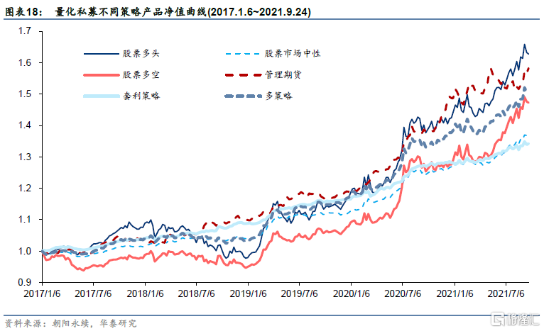 國內量化私募近10年發展迅猛,頭部機構業績出色。國內量化私募發展可分爲兩個階段:第一階段在2010年至2015年之間,量化私募以中低頻股票多因子模型爲主要策略形式,發展形勢較好,但具有風險敞口過大的問題。第二個階段在2015年後,量化私募策略注重於精細化挖掘alpha、嚴格控制風險,形成了以股票策略爲主,CTA、宏觀、套利策略爲輔的市場格局,近年來成長出一批管理規模在百億以上的量化私募。2017年以來,量化私募股票多頭類產品年化收益率最高(11.23%),管理期貨類產品年化收益率其次(10.55%)。我們針對規模百億以上的頭部量化私募進行統計,可知其各類產品的年化收益率都優於量化私募整體表現。