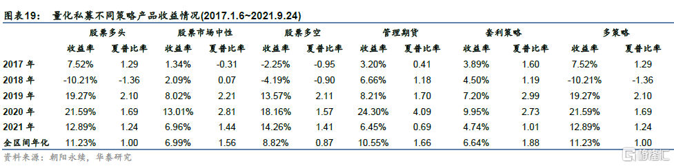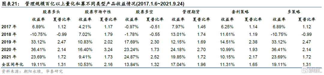我們計算6類量化私募產品的指數,並統計指數逐年的收益率和夏普比率,展示在圖表18和圖表19中。(指數的計算方法是:計算所有屬於該類指數產品的周頻淨值收益率,然後算出周頻平均收益率,再連乘得到該類指數。私募業績一般在週五披露,由於2021年9月24日是9月的最後一個週五交易日,本文計算的截止日期是2021年9月24日。夏普比率計算中,假設無風險收益率爲2%。)