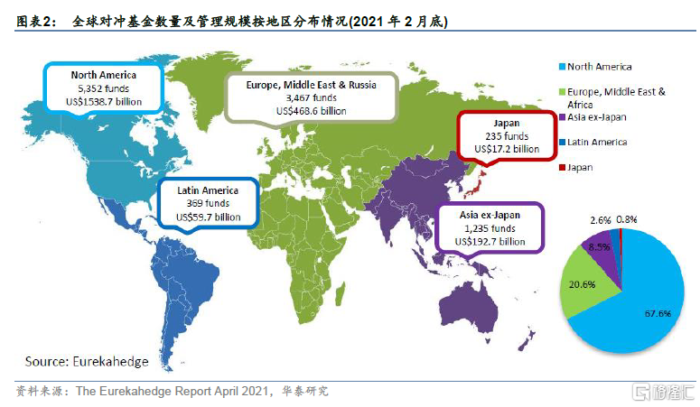 如圖表2所示,根據Eurekahedge在2021年2月底的統計,全球對衝基金總管理規模約爲2.31萬億美元,其中北美市場管理規模約爲1.54萬億美元,佔比67.6%。其次是歐洲、中東及俄羅斯,合計佔比約20.6%。亞洲地區總共佔比9.3%,其中日本佔比約0.8%。