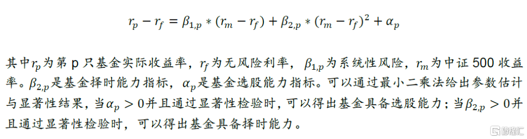 我們使用T-M模型,對部分量化私募的中證500增強基金進行選股擇時能力分析。T-M模型公式爲: