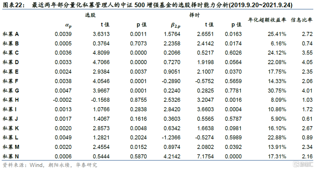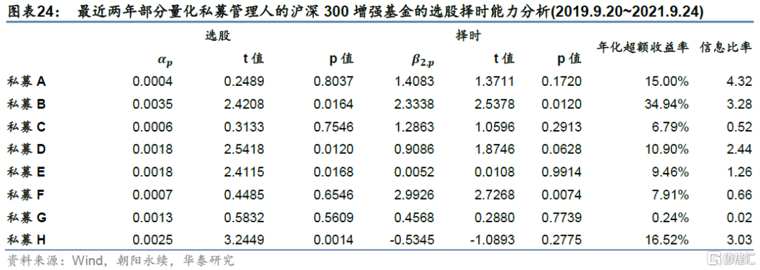 下圖爲最近兩年部分量化私募管理人的滬深300增強基金的選股擇時能力分析結果。從p值來看,這些管理人的超額收益更多來自選股,私募B具有較好的選股和擇時能力。