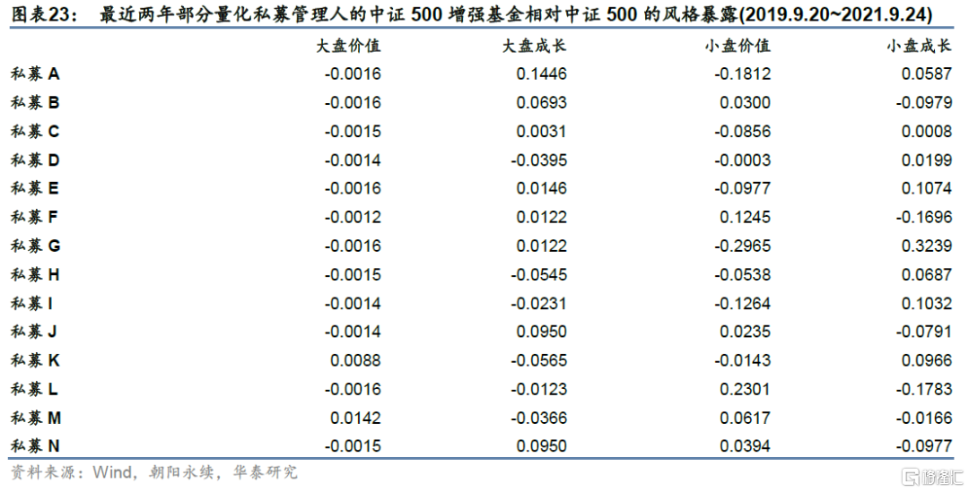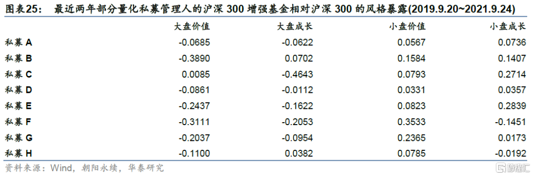 我們選取最近兩年部分量化私募管理人的滬深300增強基金,對其進行風格歸因,結果如下表所示。可知表中多數私募相對滬深300低配大盤價值風格,高配小盤價值風格,對其他風格的暴露則有一定差別。