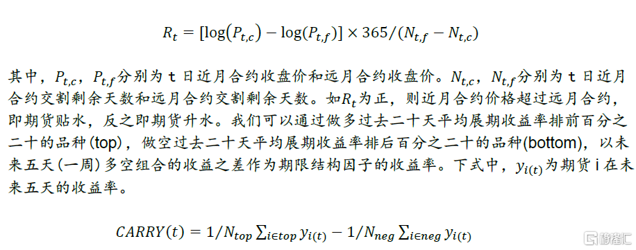 每個商品期貨品種有多個交割日期不同的合約,同一天所有合約的收盤價構成了商品的期限結構。遠月(交割日期較遠的月份)合約收盤價低於近月(交割日期較近的月份)合約收盤價的情況稱爲期貨貼水(Backwardation),而遠月合約收盤價高於近月合約收盤價的情況稱爲期貨升水(Contango)。期限結構的產生與市場對未來價格的樂觀程度(即通過現貨庫存、持有成本、無風險利率等因素對未來期貨價格向上或向下趨勢的判斷)相關。隨着交割日期的接近,期貨價格會逐漸趨近現貨價格。一般在此時,貼水的期貨品種價格會上揚,升水的期貨品種價格會下跌。部分套利策略會在升水、貼水價格向現貨價格的收斂中獲得收益。本文使用的期限結構因子爲展期收益率(roll-return),展期收益率的計算方法如下: