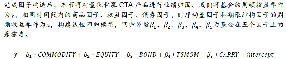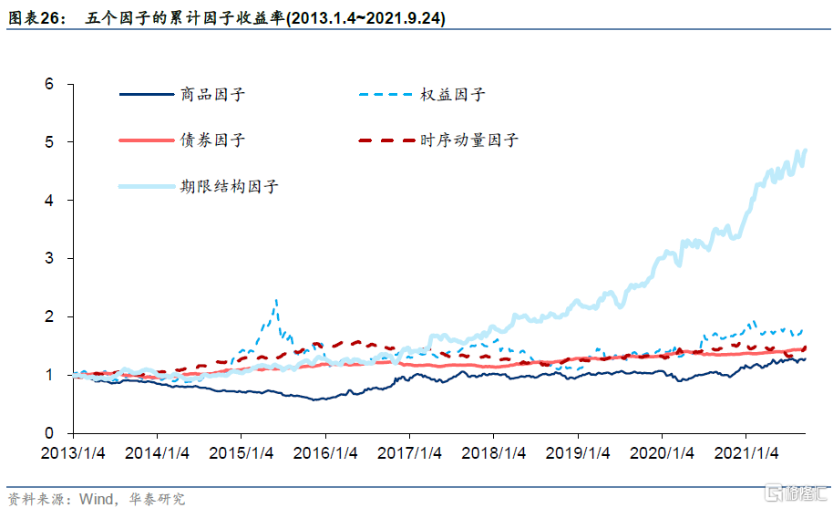 因子構造是CTA業績歸因的主要部分,本文選擇的因子爲:商品因子、權益因子、債券因子、時序動量因子和期限結構因子。其中商品因子、權益因子、債券因子屬於市場因子類,時序動量和期限結構因子屬於風格因子。
