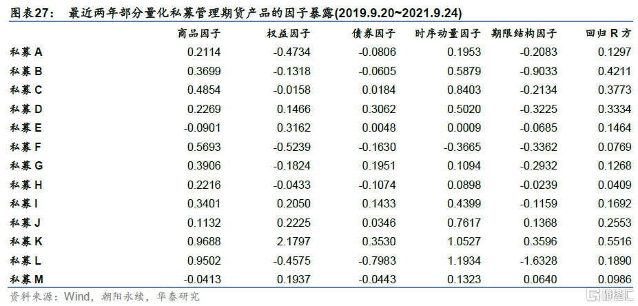 我們選取最近兩年管理期貨產品收益較高的部分量化私募管理人,計算其產品的因子暴露。可知大部分管理人在商品因子上有正暴露,近兩年商品市場的良好表現爲這些管理人貢獻了一定收益。此外大部分管理人在時序動量因子上有正暴露,在其他因子上的暴露方向有一定差異。