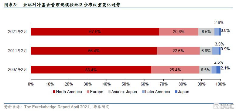 圖表3展示了2007年2月、2011年2月、2021年2月三個截面上對衝基金管理規模按地區分佈權重的變化情況。可以發現,北美地區佔比隨時間推移在逐漸上升,而歐洲地區佔比在逐漸下降。除日本外亞洲地區佔比從2007年的6.5%逐漸上升到現在的8.5%。