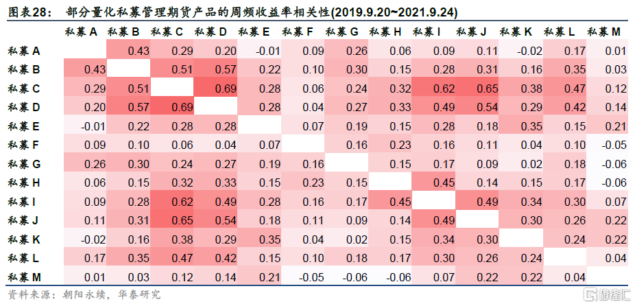 我們對圖表27中的量化私募管理期貨產品進行相關性分析,結果如下表所示。