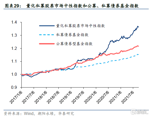 由圖表29和圖表30可知,與同是絕對收益性質的公募和私募債券基金指數相比,量化私募股票市場中性指數在每年保持正收益的同時,獲得了更高的絕對收益。量化私募股票市場中性指數與公募債券型基金指數相關性較低。
