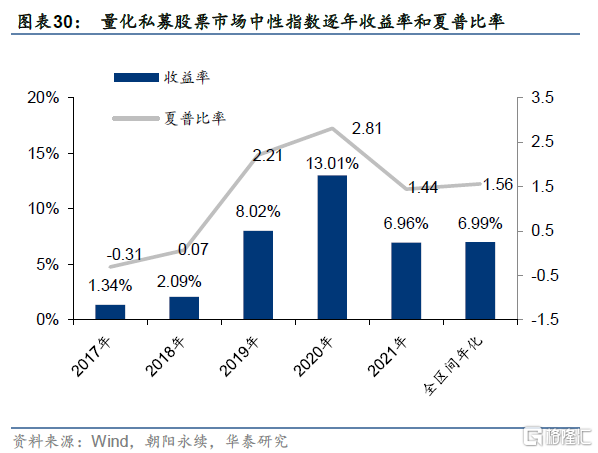 (3) 作爲數量僅次於多頭產品的另一類股票類產品,股票市場中性類產品年化收益率爲6.99%,夏普比率爲1.56,且每年都有正收益,具有良好的絕對收益屬性。