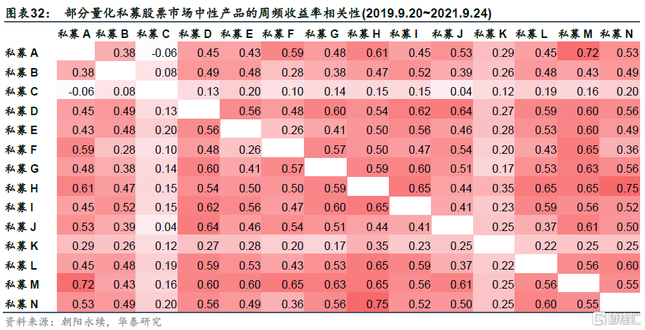 接下來我們以私募管理人爲研究對象,對各個私募管理人股票市場中性產品計算平均收益率作爲該管理人的產品業績。我們選取最近兩年股票市場中性產品收益較高的部分量化私募管理人,計算產品相關性,結果如下圖所示。