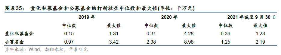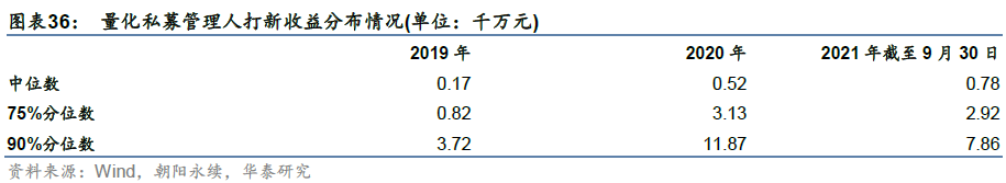 接下來我們以量化私募管理人爲口徑,統計管理人的打新收益分佈情況。可知從2019年到2021年,量化私募管理人打新收益中位數在上升,但75%分位數和90%分位數先升後降,說明2021年各管理人的打新收益水平差距縮小。