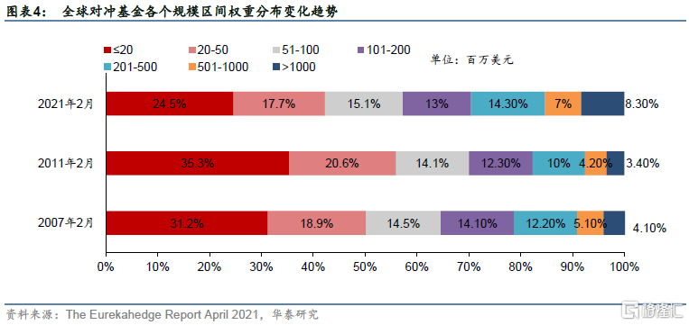 由下圖可知,從2007年2月到2011年2月,小於兩千萬美元管理規模的基金增長最快,可以推測該段時間內對衝基金行業仍處於“野蠻增長”時代;而從2011年1月至今,小規模基金佔比萎縮,大於2億美元規模的基金所佔比例出現較大幅度上升,其中大於10億美元規模的超大基金佔比翻了一番以上。這一現象表明目前全球對衝基金行業可能已顯現出頭部效應。