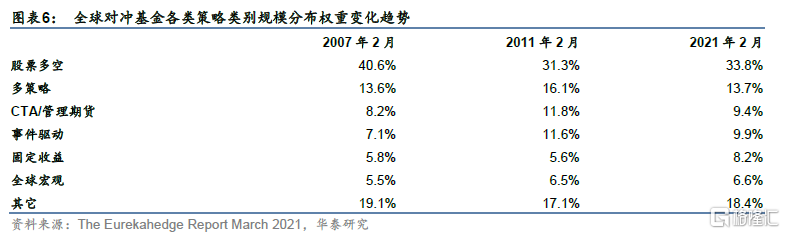 Eurekahedge將對衝基金策略分爲多個類別,主要包括:股票多空(Long/short equities)、多策略(Multi-strategy)、CTA(CTA/managed futures)、事件驅動(Event driven)、固定收益(Fixed income)、全球宏觀(Macro)和其它策略,其中最重要的策略是股票多空,佔比約三分之一左右。由下圖可知,2011年2月和2021年2月的策略分佈權重比較相似,股票多空佔比上升2.5個百分點,多策略、CTA、事件驅動的佔比略下滑,固定收益、全球宏觀佔比上升。