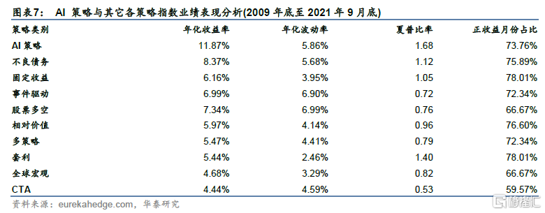 使用人工智能(Artificial Intelligence,簡稱AI)的對衝基金正在逐漸進入投資者的視野,並帶來長期的優異表現。Eurekahedge編制了Eurekahedge AI Hedge Fund Index(下文簡稱AI策略指數),基日爲2009年12月31日,我們將該指數與其它指數在2009年底至2021年9月底區間進行業績對比分析,詳見下表。這裏需要說明的是,AI策略與股票多空、固定收益等其它策略不屬於互斥的策略種類,在其它各類策略中都有可能應用到AI技術,在下文圖表9中有更詳細的描述。從下表可知,AI 策略長期表現優於其它對衝基金策略,年化收益率和夏普比率最高。AI 策略指數正收益月份佔全部月份比例爲73.8%,處於較高水平。