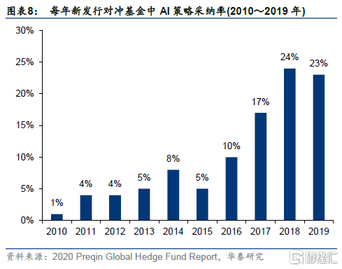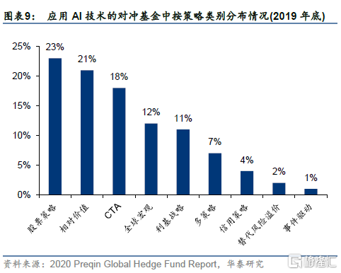 Preqin公司統計了AI策略在對衝基金中的應用情況。圖表8展示了近十年每年新發行對衝基金中AI策略採納率。可知2019新發行對衝基金中已有23%採用了AI策略,這一數值大於2016年採納率的2倍。圖表9展示了所有應用AI技術的對衝基金中按策略類別分佈情況,結果顯示AI對衝基金中以採用股票策略、相對價值策略、CTA策略的最多,三者合計佔比超過六成。Preqin針對策略類型的劃分方式和Eurekahedge有一些細微差別,但不影響投資者的理解。