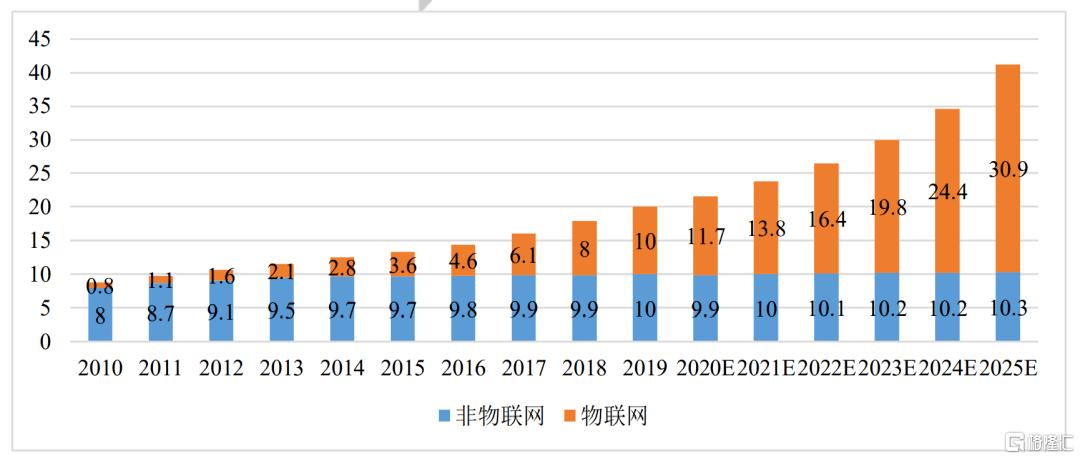 2010-2025年全球物聯網與非物聯網連接數對比及預測(單位:十億個)圖源:IoT Analytics