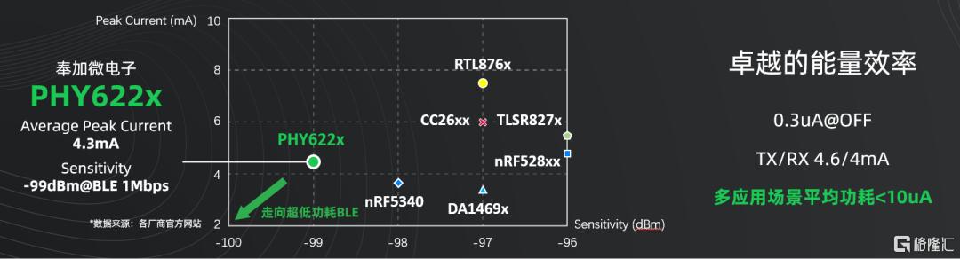 據瞭解,其接收機採用了創新的相干調解方式,在兼顧功耗水平的情況下,提供3dBm的解調增益,將通信距離和抗干擾能力提高了數倍。結合優異的射頻前端,奉加微電子的BLE、ZigBee系列產品實現了業界一流的接收靈敏度,BLE 1Mbps靈敏度達到-99dBm,遠超行業-93dBm的平均水準。射頻收發峯值功耗<4.5mA,休眠功耗最低可以實現<1uA,和眾多國際大廠處於同一水準線。這些技術優勢使得奉加微電子的產品在電池供電的IoT領域具備強大的競爭力。