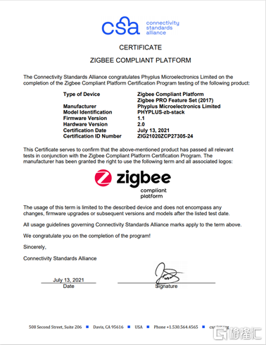 2021年7月,奉加微電子自主研發的高性能ZigBee 3.0協議棧——PHYPLUS-zb-stack——出現在了ZigBee兼容平台認證列表之中,成為大陸第二家獲得連接標準聯盟(CSA)ZigBee兼容平台認證的公司。該認證意味着奉加微電子旗下PHY62系列系統級芯片在無線電收發器和網絡協議棧軟件的組合、協議底層軟件等各方面技術指標均達到了聯盟的要求,可以實現基於ZigBee 3.0協議的各項功能。本次獲得CSA頒發的ZigBee兼容平台認證是該系列在AIoT的領域的又一里程碑。