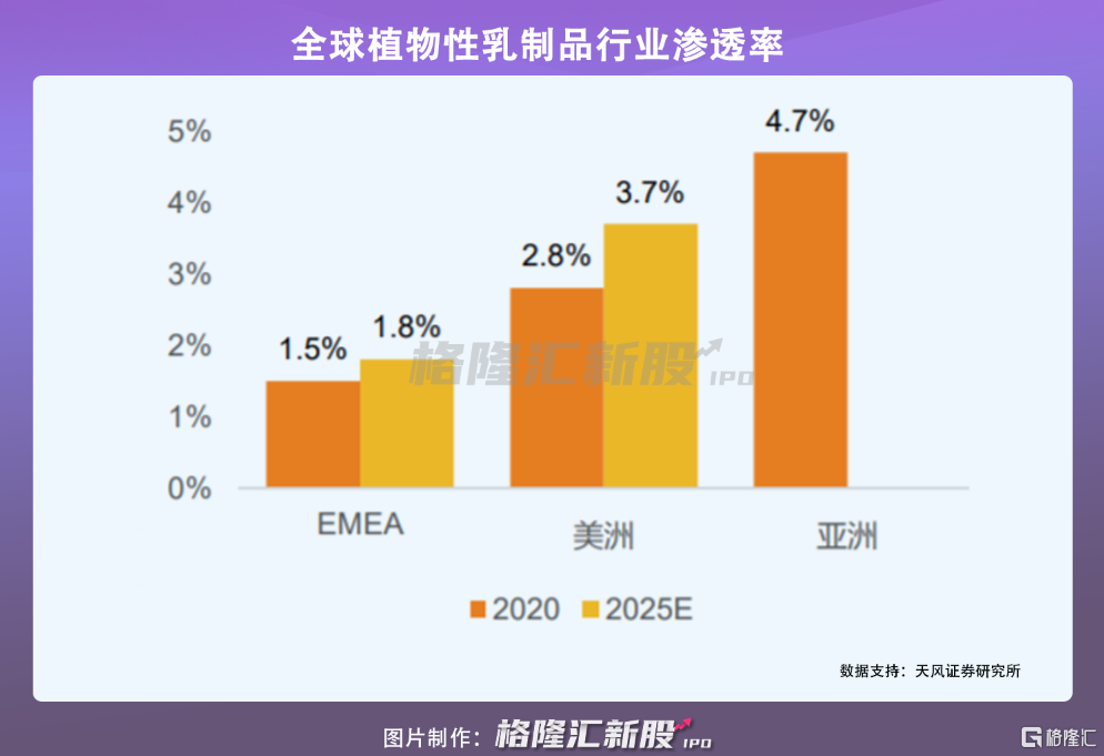 數據顯示,全球植物性乳製品在乳飲市場滲透率較低,佔比僅為9%,伴隨健康環保等理念成為越來越多消費者考慮的因素,替代牛奶尚存較大空間,植物奶市場規模將不斷擴大。