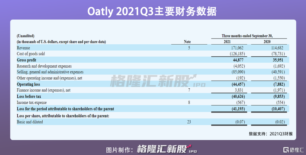 但是從Oatly的財報來看,公司盈利情況不容樂觀。三季報顯示,Oatly業績期內營收1.71億美元,同比增長49.2%,但低於市場預期的1.85億美元;淨虧損4120萬美元,較去年同期的1040萬美元擴大近3倍,期內毛利率26.2%也較去年同期的31.1%大跌5個百分點。